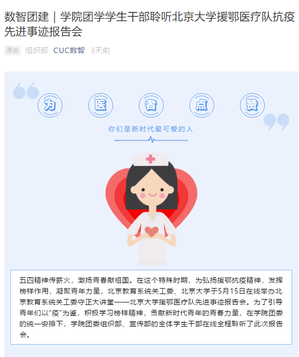 (通讯员 孙剑仪)为弘扬援鄂抗疫精神,发挥榜样作用,凝聚青年力量,5月15日上午,由北京教育系统关工委主办,北京大学关工委承办的“守正大讲堂——北京大学援鄂医疗队先进事迹报告会”在线举行。数据科学与智能媒体学院积极响应北京教育系统关工委、学校学工部号召,组织本院学生准时收看了此次视频报告会。