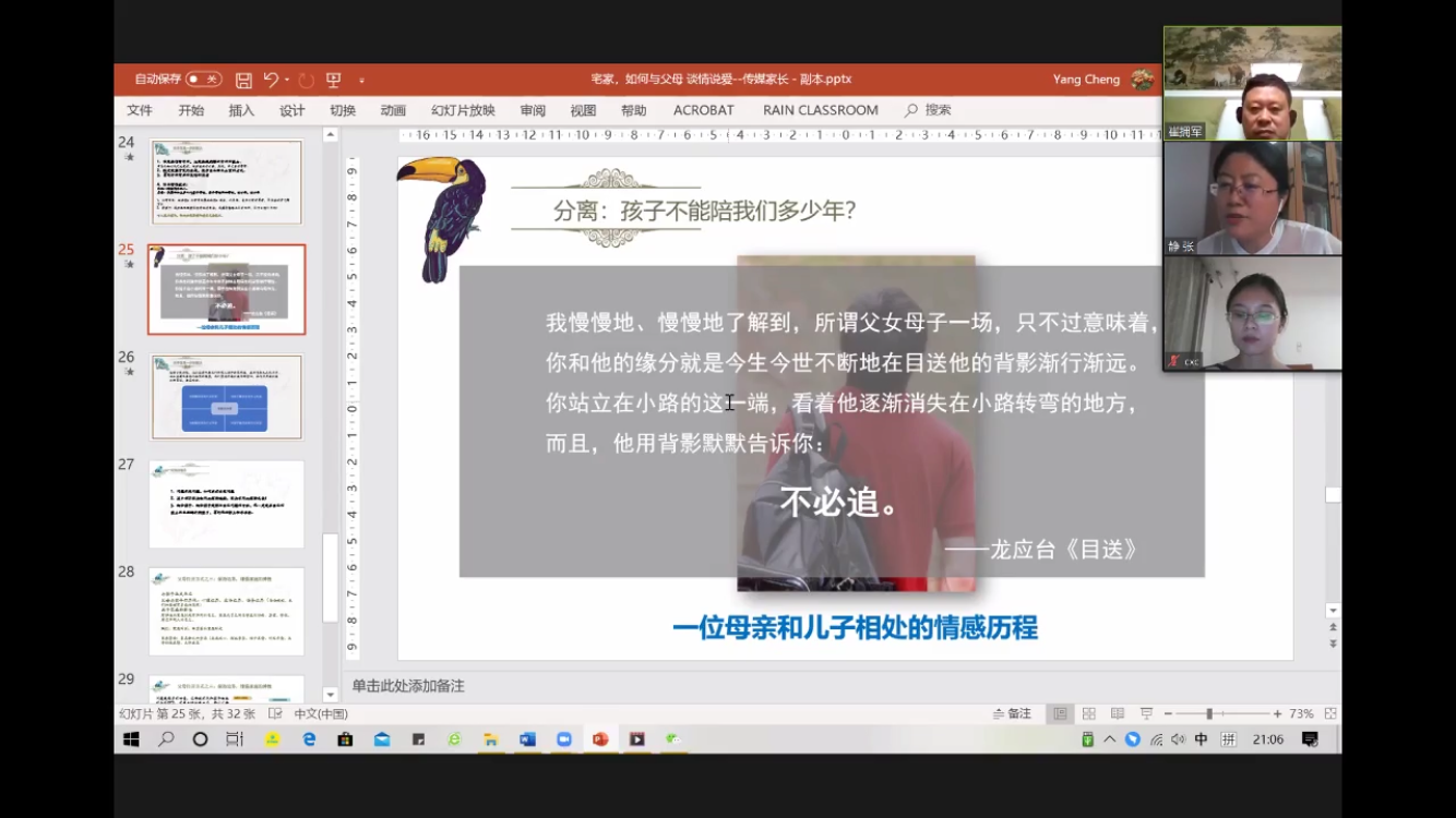 张静老师和崔拥军大夫均属于家庭治疗领域的专家,他们首先对参与讲堂的家长致以问候,并邀请家长们参与互动,共同为自己的亲子关系打分。随后,以家长和同学们在疫情期间生活方式的差异为切入点,分析这些差异在家庭关系中容易引发的问题,与家长探讨如何能让家庭中的爱在这些问题中展现出来。