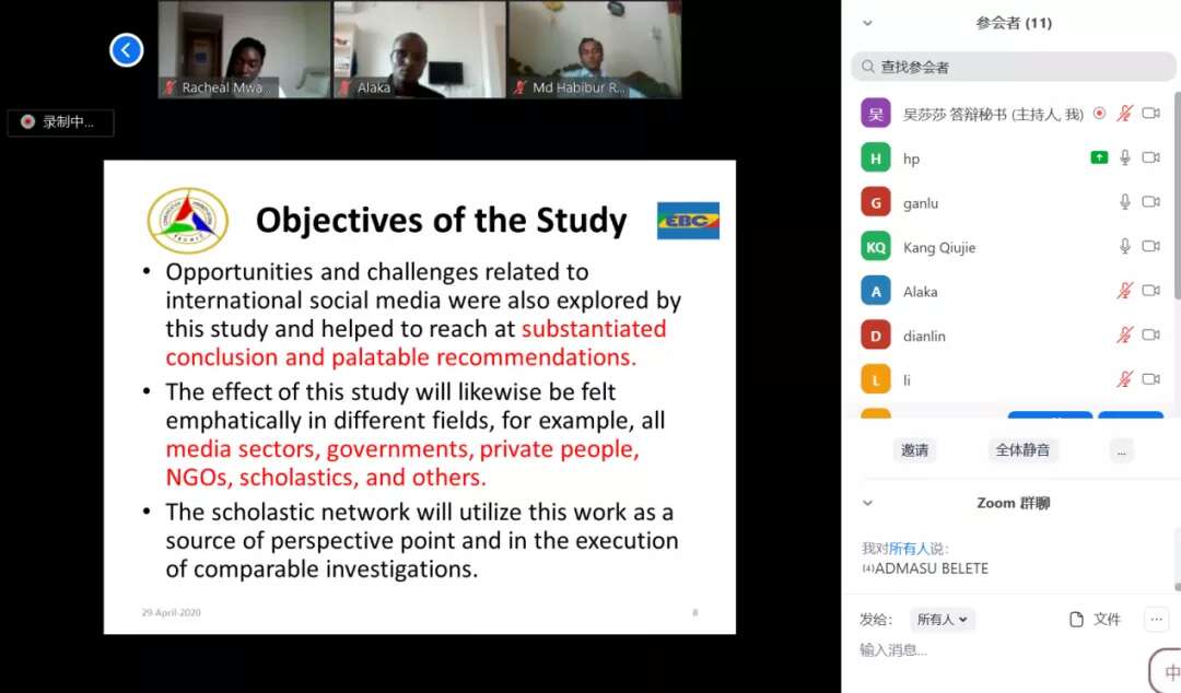 传播研究生院留学生教学办提前策划安排,开启留学生学位论文线上“云答辩”模式,制定答辩流程细则,培训各场答辩助理,借助线上会议APP、网络投票工具协同答辩,保证留学生学位论文答辩工作流程的规范和统一。来自4大洲17个国家的27名留学生一同参与“云答辩“,除了留校的12个学生,其他15名学生分别在美国、加拿大、奥地利、加纳、坦桑尼亚、纳米比亚、毛里求斯、巴基斯坦、尼泊尔9个国家参加了云答辩,发展中国家国际传播硕士项目(IMIC)、中加全球传播双硕士项目(SFU)和传播学博士班三个班毕业生在5月陆续完成线上答辩工作。