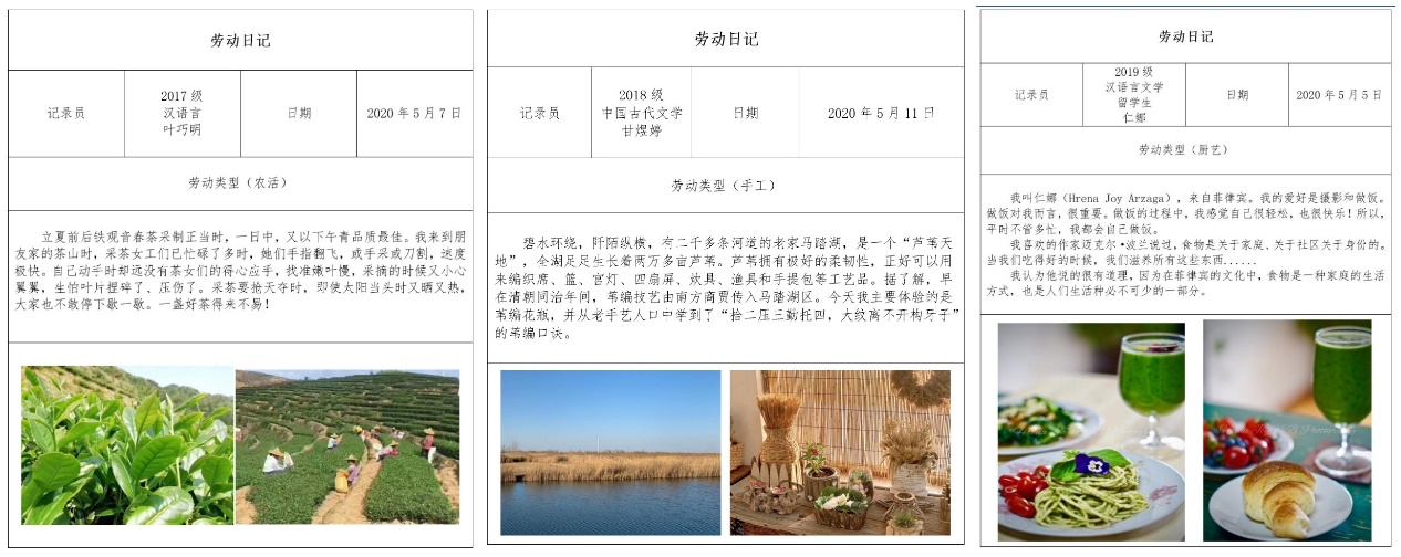 此次活动不仅吸引了人文学院全体中国同学,来自世界各国的在京、在校留学生活动也积极参与其中。大家在课余时间,走进田间,将汗水播洒进土地;捏起针线,将心灵手巧缝进手工制品;学习厨艺,将家乡的味道融入食物;做起家务,让凌乱的生活一角焕然一新。人文学院中外同学们在劳动中体验,在记录中收获,在交流中成长。