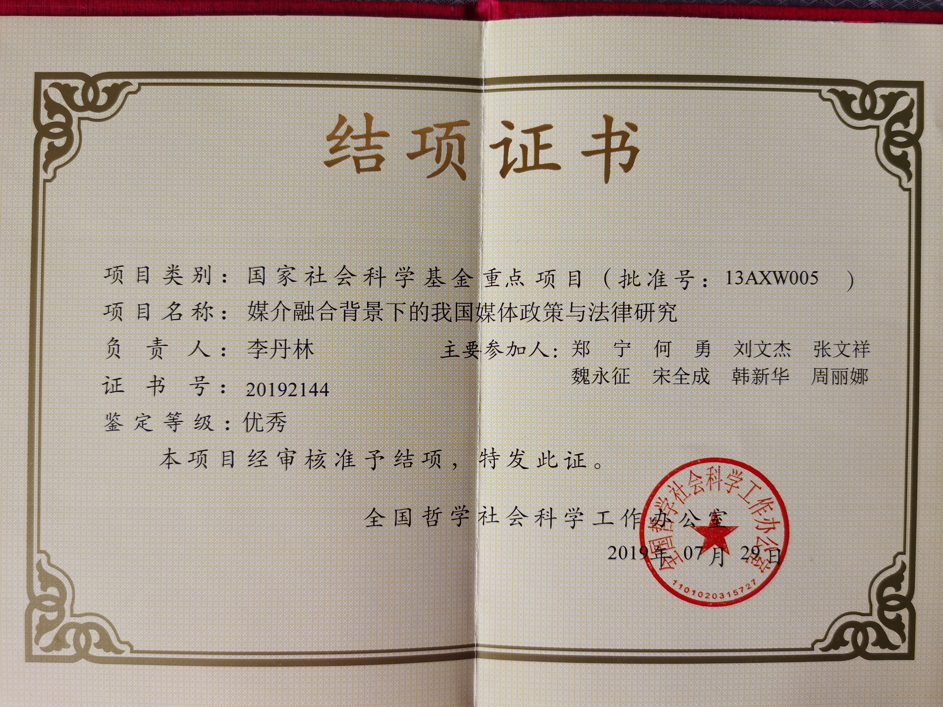 这一项目是李丹林教授申报获批的国家社科基金2013年度新闻学与传播学重点项目。项目的骨干成员有我校法律系教师郑宁、何勇、刘文杰、韩新华、周丽娜。该项目于2019年结项,结项鉴定为优秀等级。这是我校首次获得国家社科基金重点项目结项优秀等级。另悉,2019年度国家社科基金年度项目、青年项目总共申请结项数5096项,通过结项数4373,结项率85.81%,获得优秀数340,优秀率为6.67%。其中新闻学传播学学科共计申请结项190项、通过结项数152项,获得优秀数11,优秀率为5.79%。