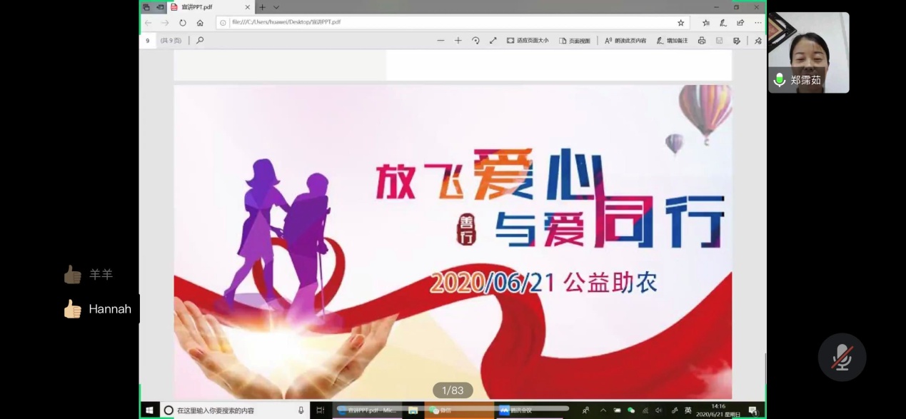 在两个半小时的线上宣讲过程中,14个公益项目的负责人各自从项目目标、项目意义及筹备情况等进行了介绍,这些项目中有从生活细节出发的“环境保护”项目,也有视角宏大,旨在文化搭台、经济唱戏,推动“一带一路”建设的项目,更有响应国家脱贫攻坚的多个项目,有同学提出“‘爱与责任’公益助农”项目,计划利用抖音平台对10个地区的特色农产品进行直播,助力脱贫攻坚。