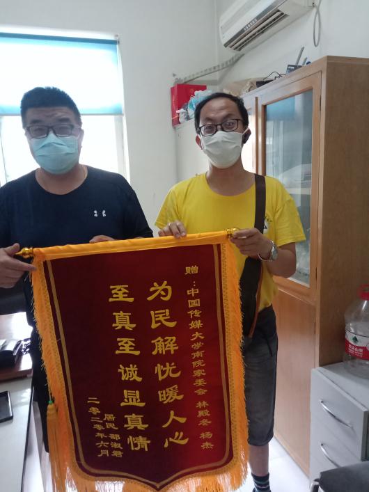 (通讯员 洪润娜)近日,后勤保障处南院家委会收到了一份特殊的礼物,家属区居民邵淑君将一面写有“为民解忧暖人心,至真至诚显真情”的锦旗送到南院家委会林殿冬、杨杰手中,以此感谢家委会工作人员在疫情期间为保护居民健康、安全所付出的辛勤努力。