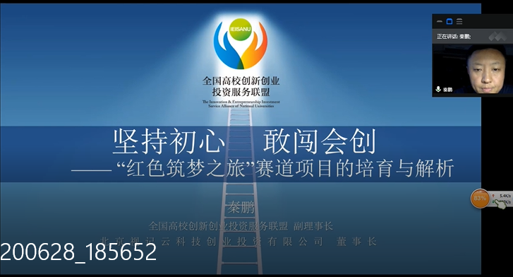 (通讯员 韦欣宜)2020年6月28日晚,中国传媒大学第六届中国国际“互联网+”大赛系列讲座之三顺利举办。此次讲座的主题为“坚持初心,敢闯会创——‘红色筑梦之旅’赛道项目的培育与解析”。主讲嘉宾为北京视记云科技创业投资有限公司董事长、北京高校创新创业投资服务联盟副理事长、全国高校创新创业实践联盟常务理事秦鹏,秦鹏老师在“互联网+”大学生创新创业项目指导方面具有丰富经验。讲座由创新创业教育中心王晓艳老师主持,150多名同学同时在线观看。