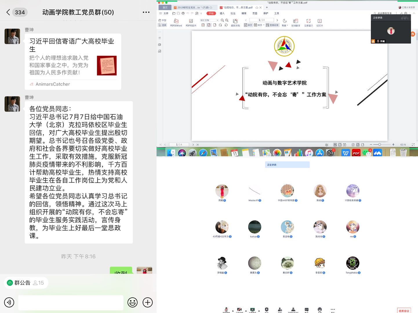 7月11日上午,学院召开“动院有你,不会忘‘寄’”线上动员会。教工党员积极带头,班主任、辅导员及任课教师也踊跃参加。学院党委书记曹坤在会议上提出期望,在活动中,要实现党员教师思想引领和价值观塑造,打造样板党支部,发挥党员先锋模范带头作用。院长黄心渊教授指出,今年是特殊的一年,这是一次难忘的记忆,学院非常感谢各位老师来参加志愿服务活动,同时也希望大家在服务的过程中程序规范、勤于沟通,让每一位学生满意。
