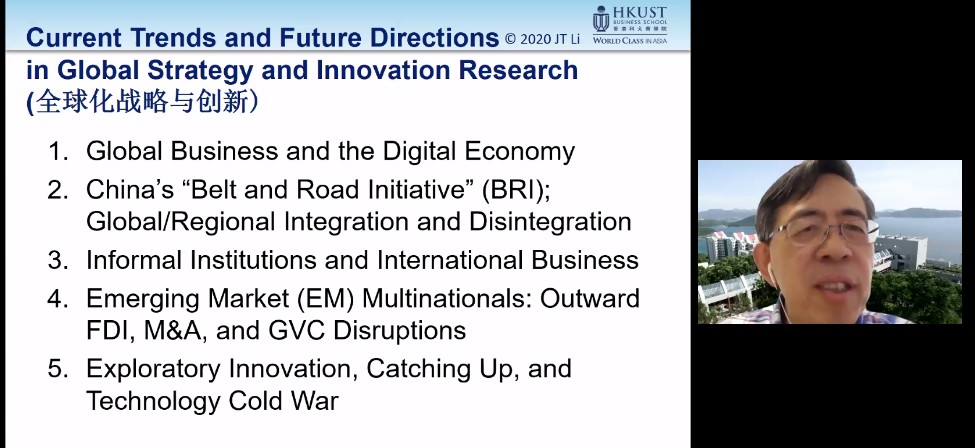 (通讯员 姜洁)7月19日下午,香港科技大学商学院利国伟商学讲席教授、美国国际商务学会院士李家涛为300多名中传MBA学子带来了题为“解绑与动荡时代下的全球化管理:引领全球市场”的线上讲座,讲座由中国传媒大学经济与管理学院党委书记薛永斌主持。