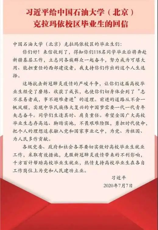 (通讯员 陶凯伦)7月7日,习近平总书记给中国石油大学(北京)克拉玛依校区毕业生回信,肯定他们到边疆基层工作的选择,对广大高校毕业生提出殷切期望。寄语他们要把个人的理想追求融入党和国家事业之中,为党为祖国为人民多作贡献。