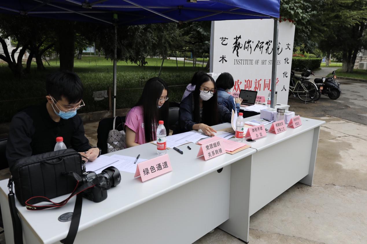 新闻学院白杨合唱团现场献唱校歌《校园里有一排年轻的白杨》,欢迎第一批报到的新生。新生们还会领取带有新闻学院Logo的防疫口罩和学院徽章。