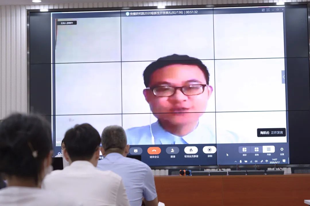 (通讯员 杜文慧 葛皓珺)9月17日下午,伴随着《校园里有一排年轻的白杨》舒缓轻快的音乐,传播研究院2020级新生开学典礼在42号楼一层会议厅拉开帷幕。按照学校疫情防控常态化的要求,今年的开学典礼采取线下线上相结合的方式进行:学院领导、教师代表及学生代表线下参会,其他同学则在云端参加。