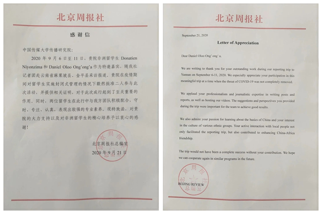 (通讯员 涂越)近日,北京周报社向我校传播研究院发来感谢信,感谢传播研究院对其《中国与非洲》杂志的支持,对两名非洲留学生Donatien Niyonzima、Daniel Oloo Ong’ ong’ a在采访报道中的表现给予肯定。
