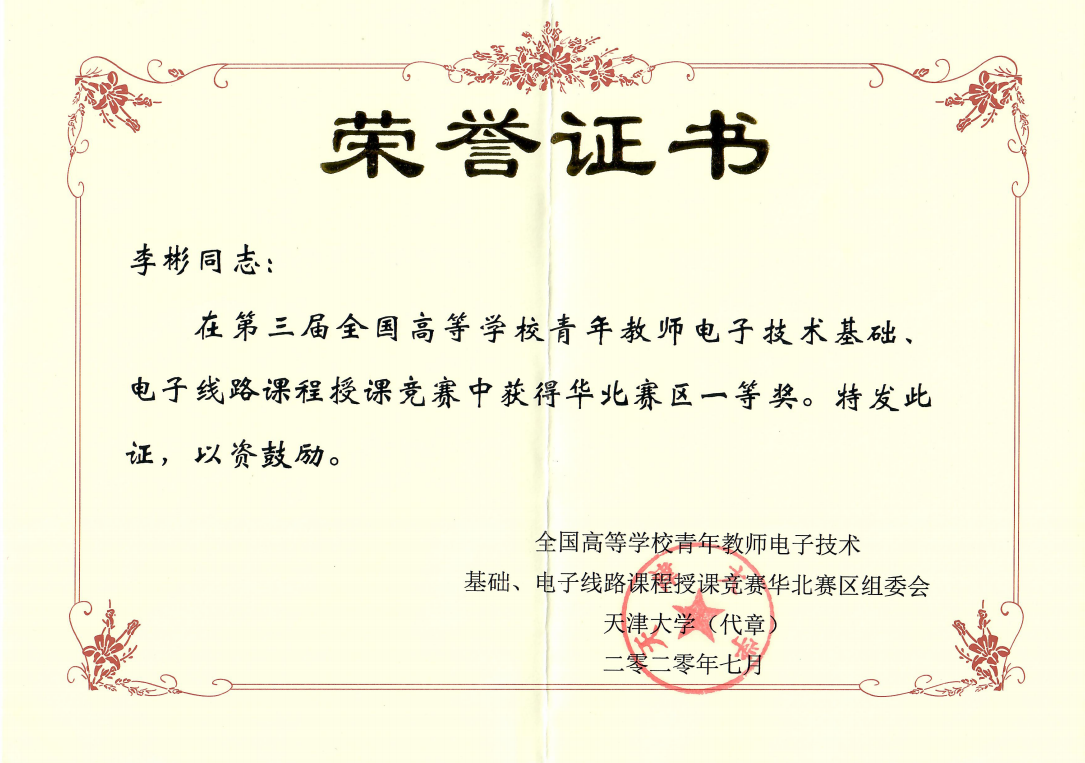 (通讯员 刘明君)在近日举行的第三届全国高等学校青年教师电子技术基础、电子线路课程(华北赛区)授课竞赛上,我校信息与通信工程学院教师李彬获得小组第二名,赛区一等奖。此次竞赛采取线上授课方式,来自北京航空航天大学、天津大学等15所院校的26名教师参加了比赛,来自清华大学、北京大学、天津大学、北京航空航天大学、北京理工大学、北京交通大学等的十余名评审专家进行了网上评审。