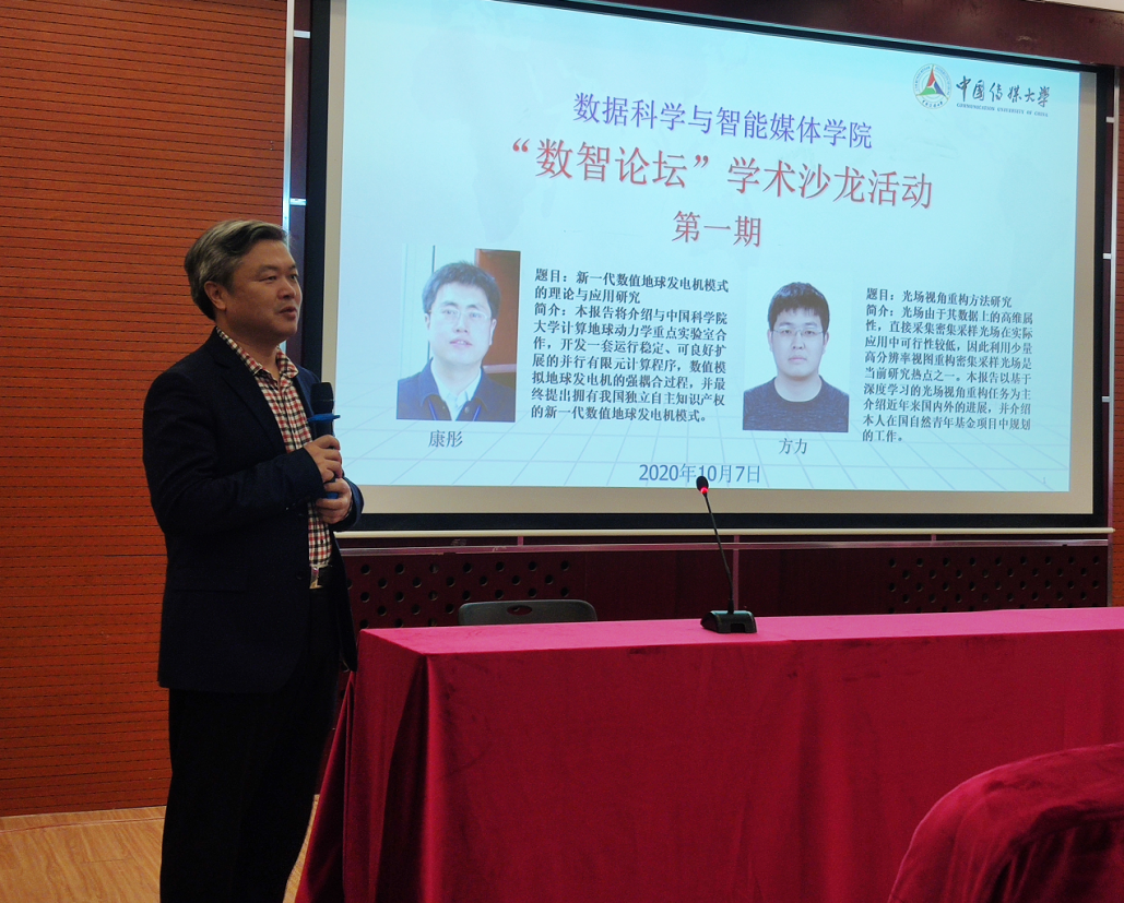 “数智讲堂”学术沙龙活动的首讲嘉宾为获批2020年国家自然科学基金项目的康彤教授和方力讲师。康彤教授在报告《新⼀代数值地球发电机模式的理论与应⽤研究》中分享了地球发电机的基本原理与待解决的关键问题,介绍了团队与中国科学院大学计算地球动力学重点实验室合作开发的一套运行稳定、可良好扩展的并行有限元计算程序以及数值模拟地球发电机的强耦合过程,并展示了拥有我国独立自主知识产权的新一代数值地球发电机模式。方力讲师的报告《光场视角重构⽅法研究》围绕具有广阔研究价值和应用前景的光场数据展开,针对直接采集密集采样光场可行性较低的实际问题以及稀疏角度采样和非朗伯两大现实挑战,总结了利用少量高分辨率视图重构密集采样光场技术的国内外研究进展,并介绍了自身在基于深度学习进行光场视角重构方面的工作。