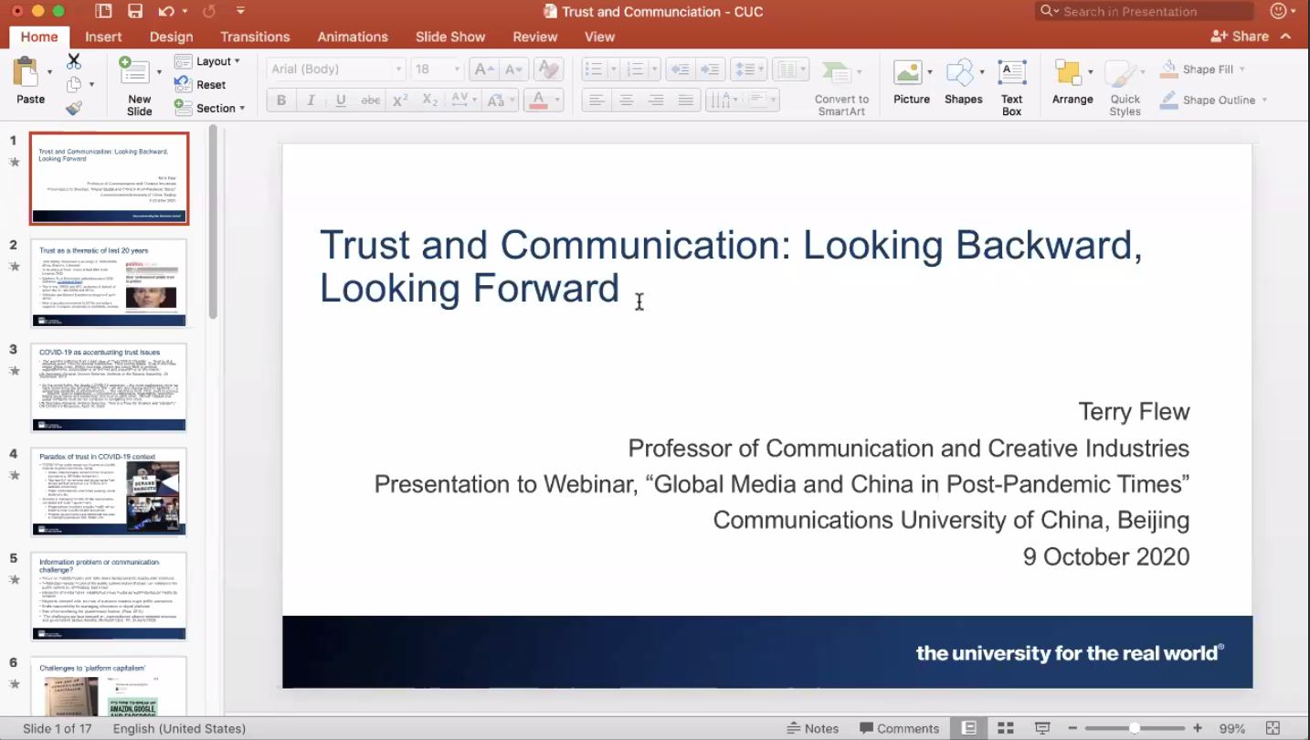 澳大利亚昆士兰科技大学Terry Flew教授的演讲题目为《数字经济中的信任、沟通和治理:回顾与展望》。新冠疫情的爆发导致了民众对信息的特殊需求。信息需求被定义为“一种适应性的人类机制,驱动人类寻找、识别并适应社会和物理环境的变化”。媒介学说为以“信任”为议题的研究提供了理论基础,从20世纪70年代大众媒体研究中的“文化指标”,到21世纪的微观、中观、宏观层面的互联网与“信任”,再到如今国际视野下的信任研究。新冠疫情恰好是一场世界范围内的实验,以检验公民对其政府的信任程度。