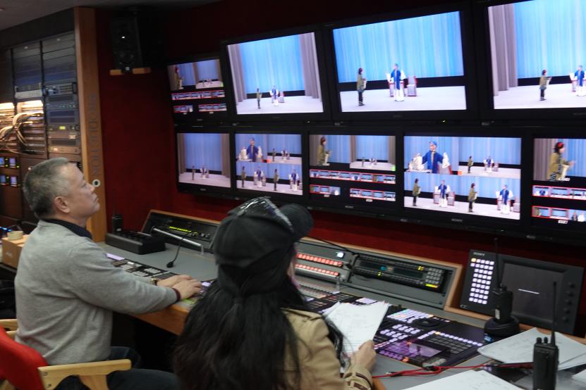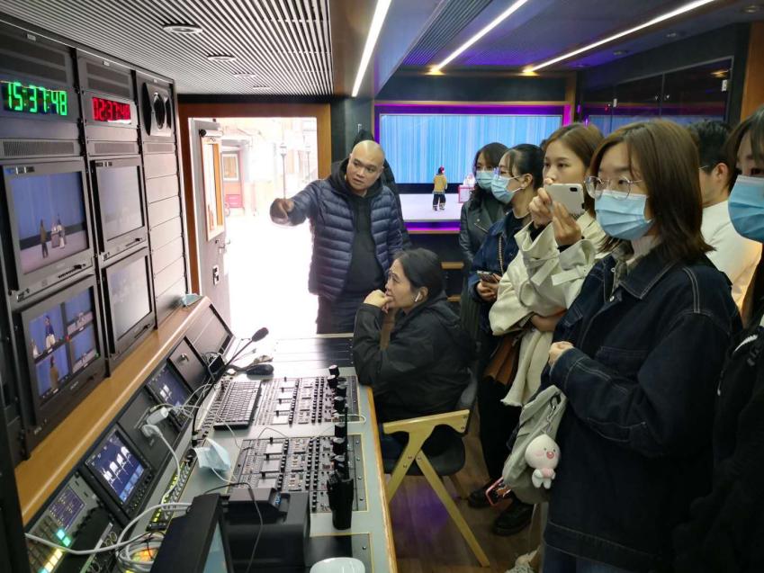 北京中数世纪传媒有限公司副总经理、“像音像”工程负责人张哲带领同学们参观4K电视转播车,现场讲解录制的流程与细节:第一遍录制演员们妆前影像以及演出全景;第二遍录制转向录音棚,确保演员声音的完美;第三遍录制,工作人员在舞台播放已有录音,演员们正式演出,场下专家老师即时指导,确保每个细节到位。这就是“像音像”工程的名字来源。