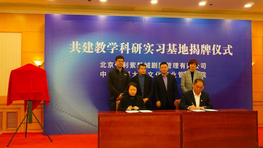 中国传媒大学文化产业管理学院副院长刘江红,北京保利紫禁城剧院管理有限公司党支部书记、总经理史永锋代表双方签署共建教学科研实习基地协议。