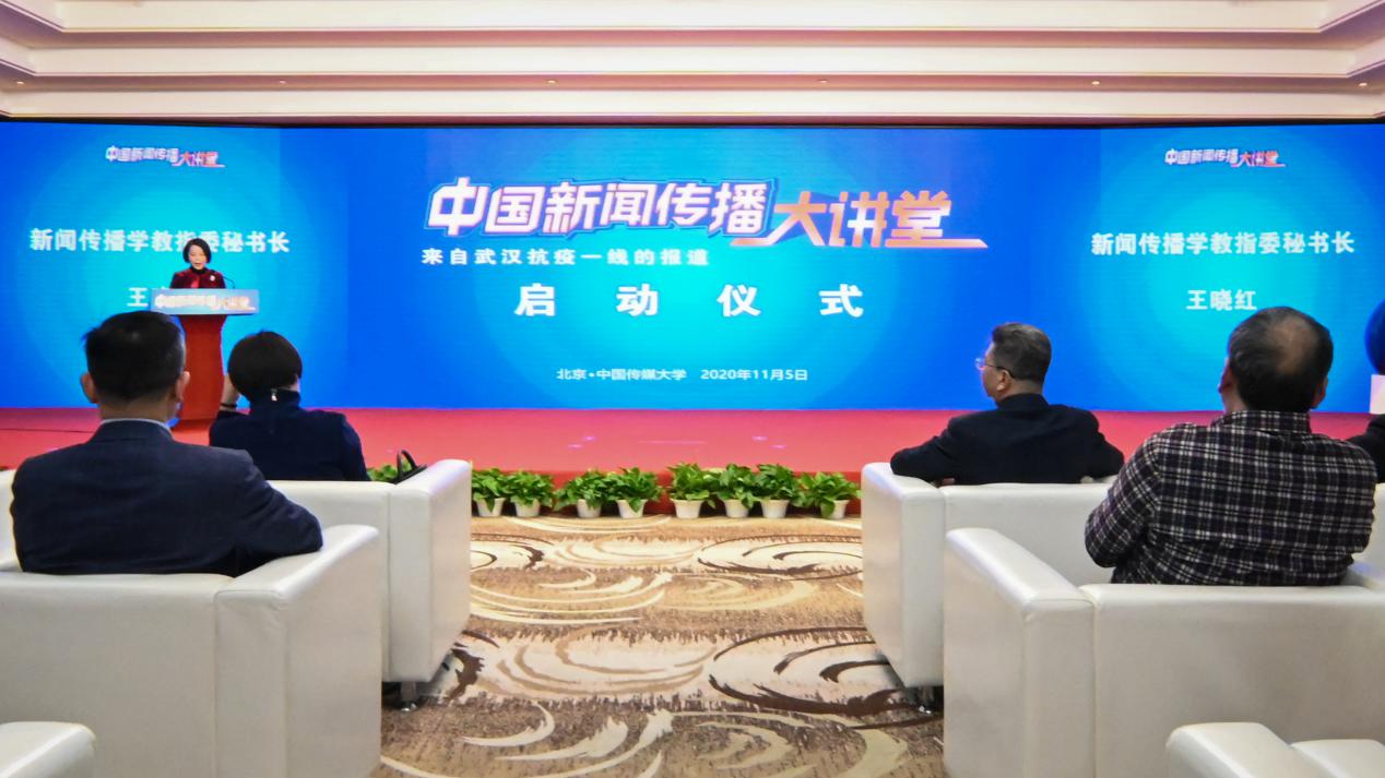 (通讯员 郑石 摄影 桂笑冬 常能嘉 王正健 李嘉伟 张云轩)2020年11月5日下午,中国新闻传播大讲堂(以下简称“大讲堂”)启动仪式在中国传媒大学举办。大讲堂是在中宣部、教育部的指导下,由中国传媒大学、教育部高等学校新闻传播学类专业教学指导委员会主办。大讲堂是教育部深入贯彻落实习近平总书记关于加强新闻舆论工作、加快推进教育现代化系列重要讲话精神的重大举措,是正式吹响新文科建设号角的首项重要工作。教育部高等教育司司长吴岩,中宣部新闻局副局长赵旭雯,中国传媒大学党委书记、校长廖祥忠,新华社总编室副主任、新华社武汉抗疫报道前指总指挥刘刚,新闻传播学教指委主任委员高晓虹在主会场出席启动仪式并发表讲话,新闻传播学教指委秘书长王晓红主持启动仪式。