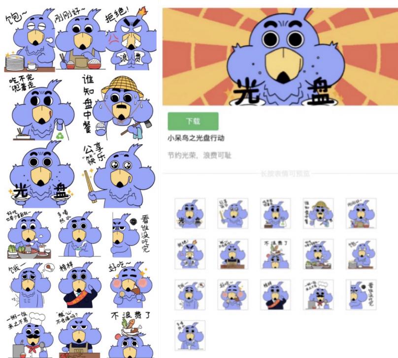 学院还发挥校友优势,以易危动物“小呆鹳”为主要形象,以“光盘行动”为主题创作表情包,通过学生喜闻乐见的方式,呼吁师生践行“光盘行动”,拒绝“舌尖上的浪费”。