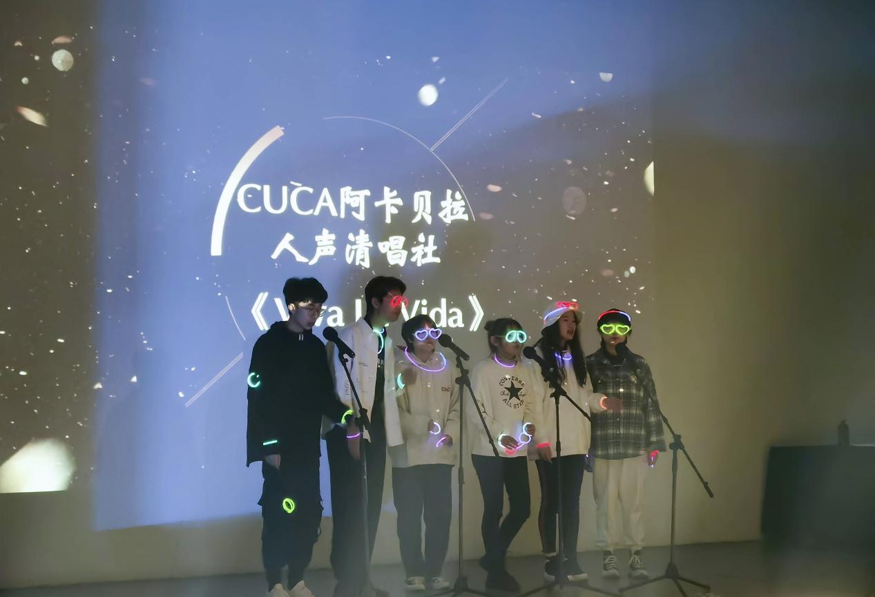 活动中,CUCA阿卡贝拉人声清唱社带来展品《Viva La Vida》,创意的荧光棒、充满活力的歌唱,诠释了歌曲生命万岁的主题。