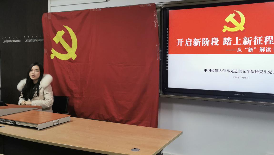 (通讯员 刘小雨)为深入学习贯彻习近平新时代中国特色社会主义思想和党的十九届五中全会精神,充分发挥优秀共产党员的模范带头作用,进一步提高入党积极分子的思想理论水平,11月18日,马克思主义学院研究生党支部在52号楼102教室举行了“开启新阶段、踏上新征程”——十九届五中全会精神学习会,进一步深化理论学习。