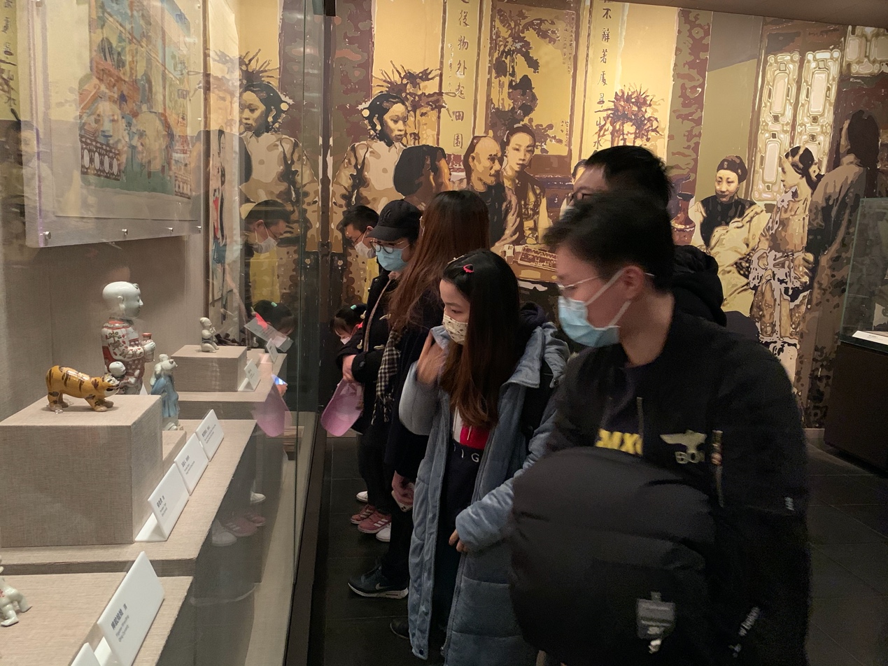 展厅第五层是“京城旧事——老北京民俗展”。以皇城为背景,将清末年至民国年间的礼俗采用戏剧化的表现手法,以文物作为道具,以最具北京民俗特色的元素符号——胡同、四合院及大幅场景画、投影短篇为舞台,强化了文化的生态性,使民俗事项的表现历历在目、清晰亲切,让同学们纷纷感叹梦回老北京的同时,对京城旧事有了更全面的理解。