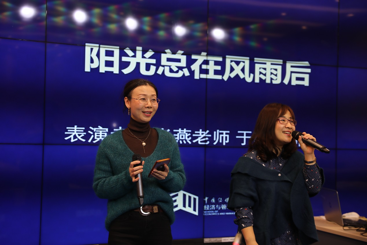 张燕和于晗老师为大家演唱了一首动听的《阳光总在风雨后》,最后,全体师生满怀深情一起合唱了《我和我的祖国》。