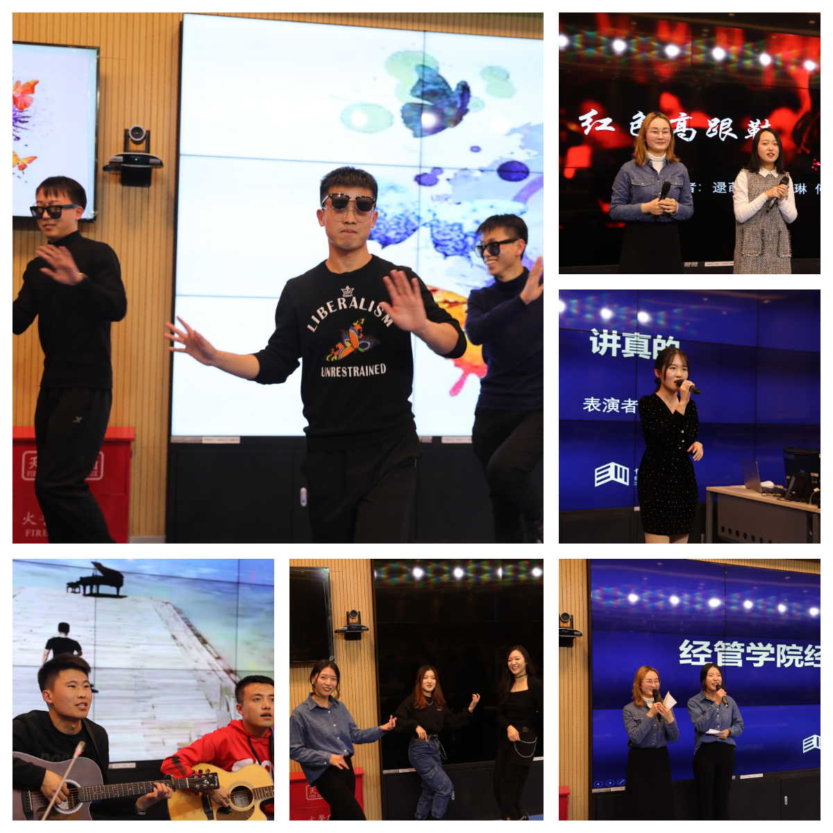 晚会上,各种节目轮番上场,异彩纷呈、魅力四射,创意的歌曲串烧、有趣的魔术表演、文艺的日语合唱都精彩绝伦,主持人带来的拉丁舞蹈更是将联欢会带入了高潮,接着,同学们又带来了单人独唱、吉他弹奏等节目。尤其让大家印象深刻的是三位男生带来的动感十足的广场舞,动感之余三位同学的夸张表演又为舞蹈增添了不少喜剧效果,令人捧腹。