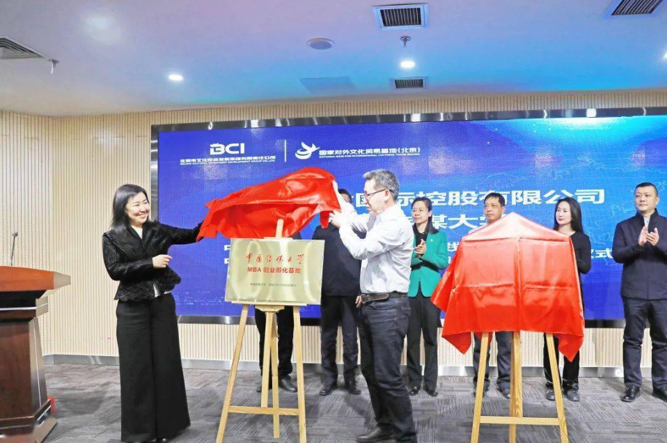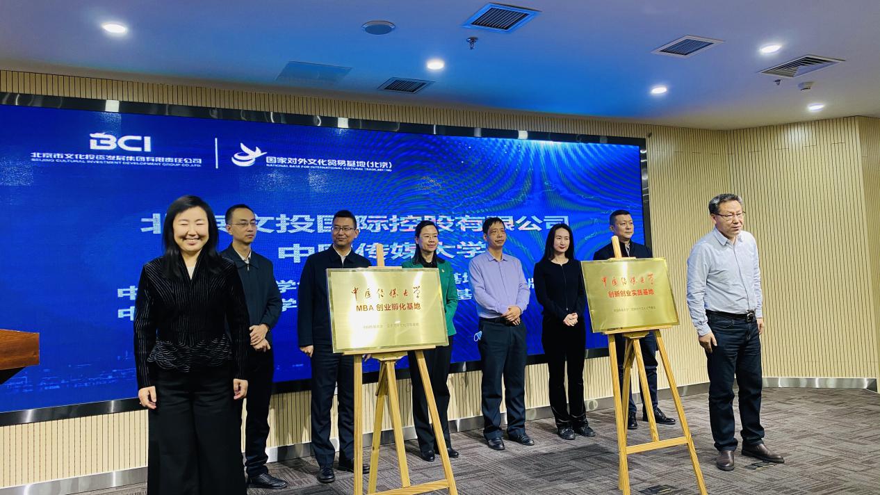 中国传媒大学经济与管理学院党委副书记毛建国与北京文投国际控股有限公司总经理卢海红共同为“中国传媒大学创新创业实践基地”及“中国传媒大学MBA创业孵化基地”揭牌