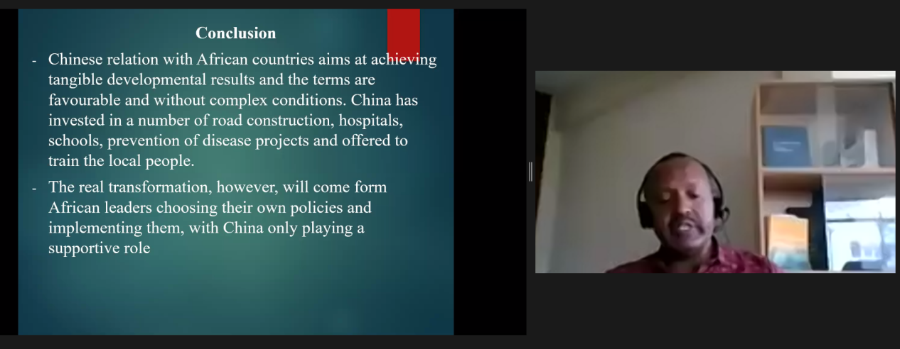 来自人类命运共同体东非研究中心(坦桑尼亚)的André Dominic Negussie发表了题为“人类命运共同体:从非洲的角度看中非关系”的演讲。Negussie为大家讲述了中非关系发展的历史,通过分享生动的实例展示了中国作为非洲大陆最大的合作伙伴对非洲各方面发展起到的重要作用。他强调,中国正在以实际行动证明并践行中非命运共同体的构建,以一系列合作项目、商品援助、技术合作、人道主义援助以及疫情期间所提供的医疗救助等为基础,不断推动双方共同发展,他坚信全人类的发展是“你中有我,我中有你”的,且“一荣俱荣”,因此要坚定不移地共同合作,为全人类更美好的未来而努力。