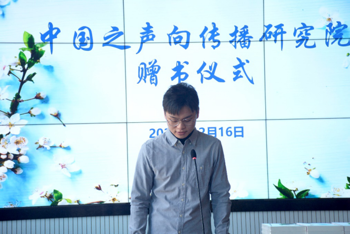 (通讯员 彭聪 魏莫愁)12月16日上午,中央广播电视总台“中国之声”向传播研究院赠书仪式在学院D03会议室举办。传播研究院院长李舒、党委书记付长海、副院长李继东、党委副书记赵丹、博士研究生辅导员杨丽莉老师以及2020级各班班长学委参加了此次赠书仪式。仪式由博士生陈强主持。