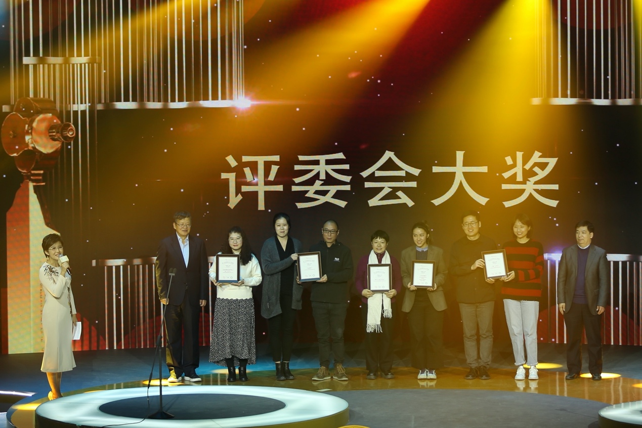 中国传媒大学党委副书记姜绪范,国家广电总局重大题材理论文献片创作领导小组副组长、中国传媒大学博士生导师金德龙颁发评委会大奖