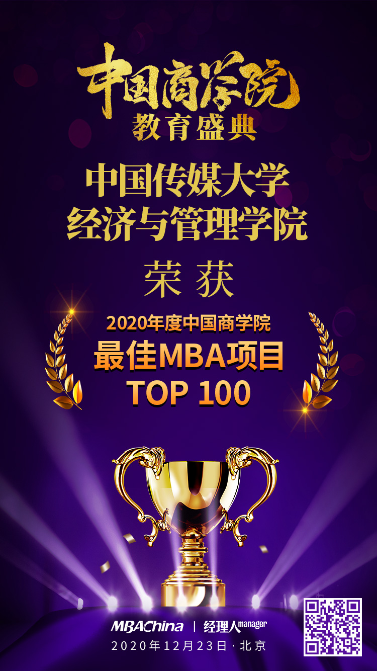 (通讯员 周超瑾)12月23日,由MBAChina与《经理人》杂志联合主办的“2020中国商学院教育盛典”在京举行,全国各地200多所商学院项目参与评选。中国传媒大学经济与管理学院MBA项目荣获“2020年度中国商学院最佳MBA项目TOP100”和“2020年度中国商学院最具特色MBA项目”两项大奖。