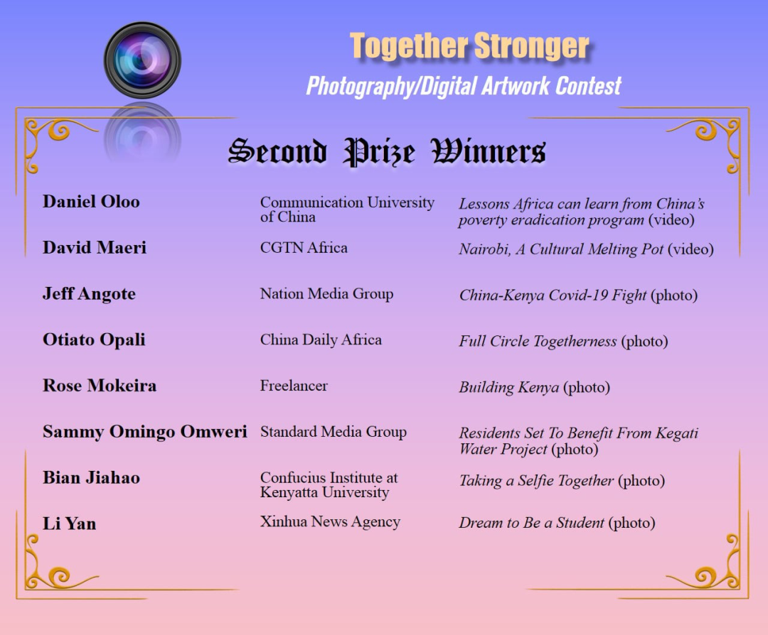 据悉,这次活动收到了大量佳作,主题涉及人文交流、各领域多边合作、团结抗击COVID-19等不同国家与人民的故事。在评审中,共有38件优秀摄像摄影作品脱颖而出,大部分来自国际主要媒体组织的专业记者、摄影师和平面设计师,包括中国国际电视台非洲分台(CGTN Africa),中国日报非洲版(China Daily Africa)、新华社、国家媒体集团(Nation Media Group)和标准传媒集团(Standard Media Group)等。