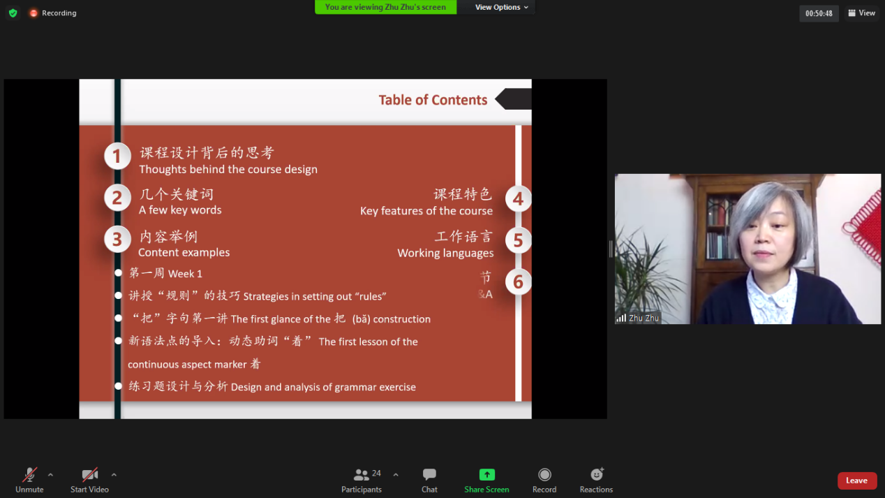 在本次公开课中,朱珠博士详细介绍了即将开班的中文语法教学互动培训课程的设计理念、课程安排以及课堂组织形式,并通过丰富的课堂实例展示了如何在课堂上将“把”字句、动态助词等复杂、难以理解的语法现象通过实用、生动的方式传授给学生。课后朱珠博士还就教材选择、课程互动环节安排等老师们感兴趣的问题做出了回答。朱珠博士丰富的教学经验、精确生动的语言表达以及对中文教学的热爱让每一位参加公开课的老师都对之后的互动课程充满了期待。