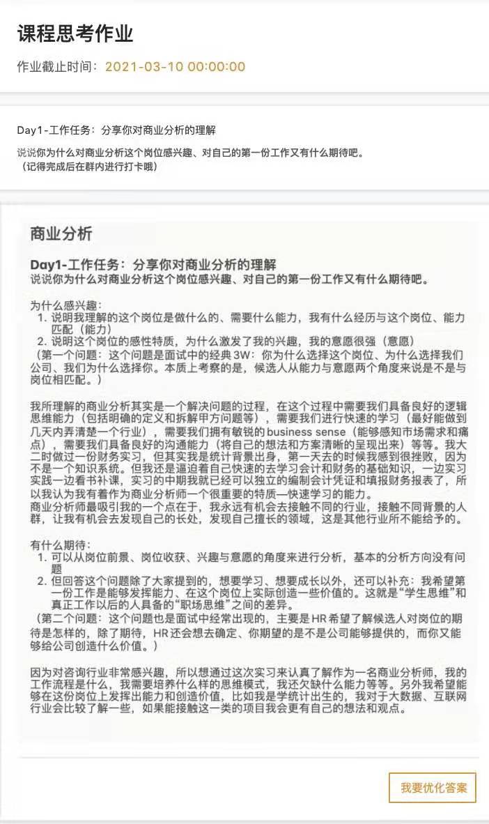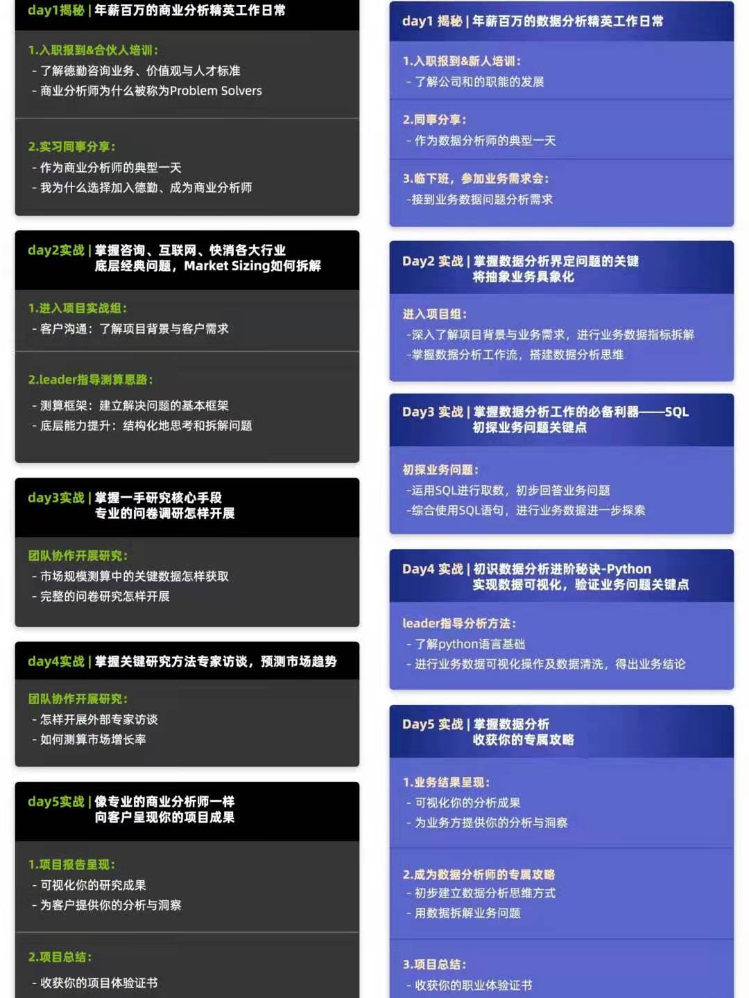 本次体验营包括两个职业类别,分别为腾讯教育数据分析师职业体验和德勤咨询商业分析师职业体验。活动由职场从业者带队,以“课程打卡+微信群作业讲解”形式在线上进行模拟岗位体验,包括入职报到、进入项目实战组、初尝业务问题、团队协作开展研究、项目总结等多个环节。参与体验的学生覆盖大一到研三各年级,参与总人数达100以上。此外,体验营还提供了简历制作、笔面试技巧、网络求职攻略等免费学习课程,助力毕业生春招求职之路。