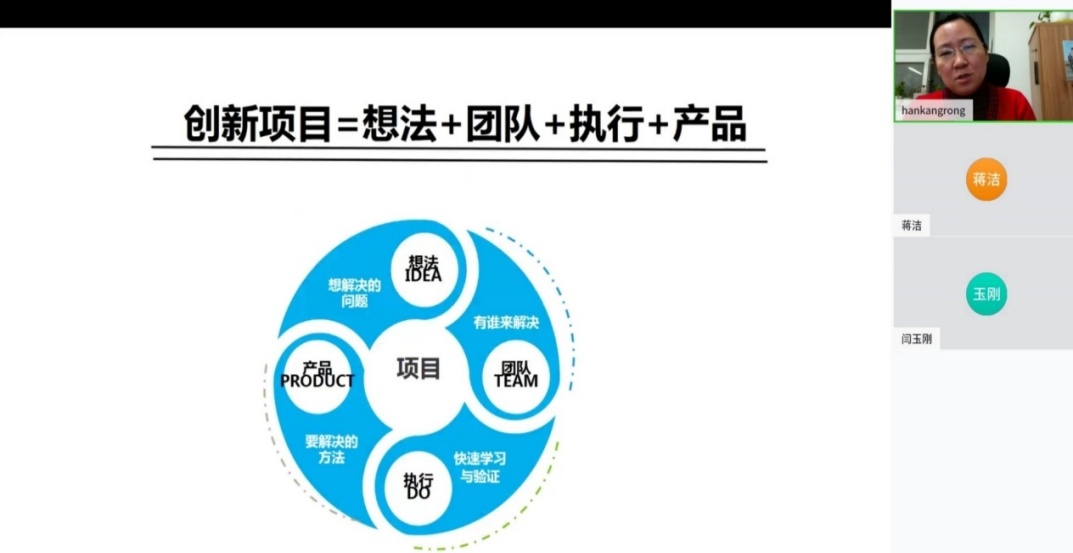 韩康榕老师首先向同学们阐释了创新创业的基本规范流程,并解释了同学们对创新的一些误解。随后,她结合自身多年指导经验,从“大创的重要性、如何选题、如何选导师、团队来源、团队执行力、项目成果展示”等方面通过实例进行了较为详细的讲解,并全面介绍了大学生创新创业活动的实操细节。最后,韩老师强调了一些创新项目的可行性和参与项目的必要性,对同学们参与的积极性提出期待。