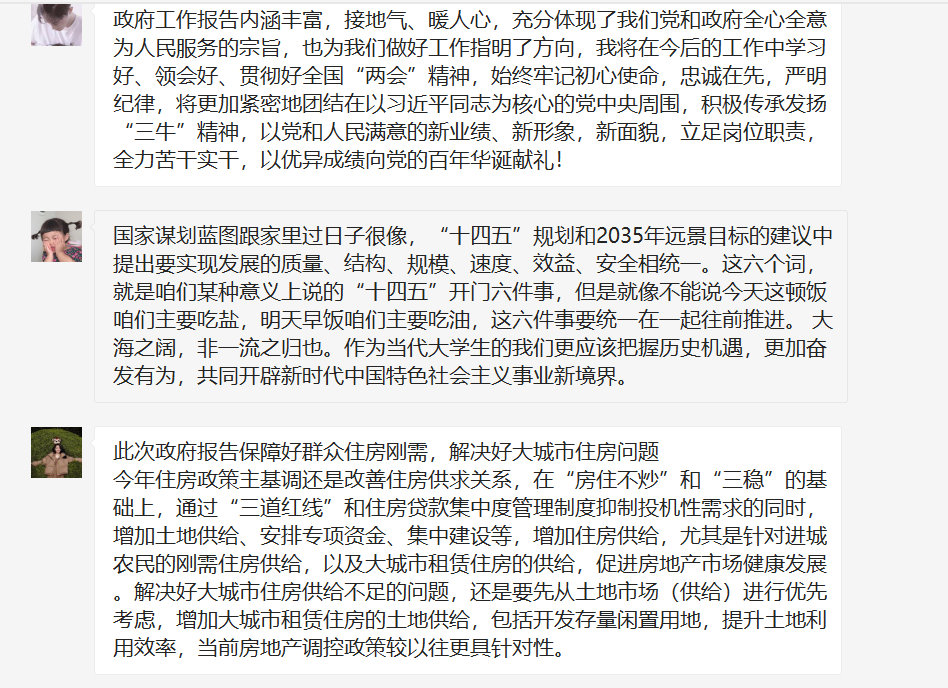 各团支部通过观看“两会”盛况、关注最新动态、组织精神讨论等方式,全方位、多角度地学习“两会”精神。多数团支部采取了召开线上学习会的方式,如2020级工商管理(1班)、管理科学与工程(2班)团支部依托线上平台进行交流,让同学们自主学习总结、自主归纳发言。此外,2018级数字经济团支部组织全体学生在微信群中分享自己的学习心得,让每个同学都能积极参与其中、学有所得;2019级数字内容管理团支部利用了线上会议室,让同学们面对面针对热点问题进行探讨,并对“两会”意义进行了深刻的阐述与分析,有效强化了同学们对“两会”内容的认知。普研博士、工商管理硕士及威敏国际项目等研究生也积极学习“两会”精神,如2019级广播电视硕士团支部的同学在观看“两会”直播、交流讨论后结合班团目标发表了各自见解,并表示受益匪浅。