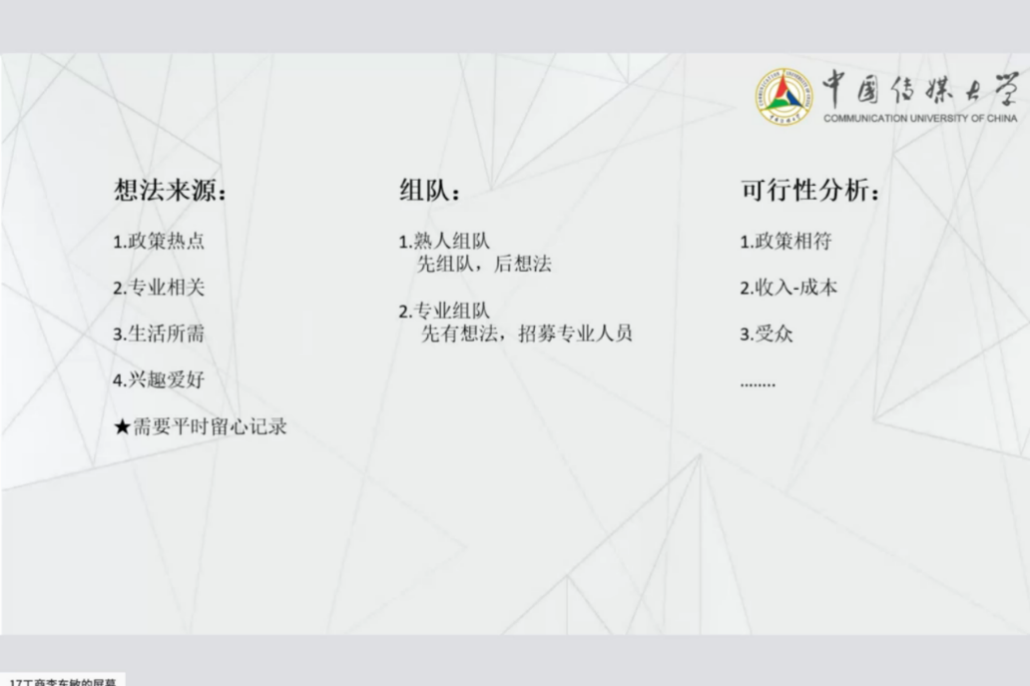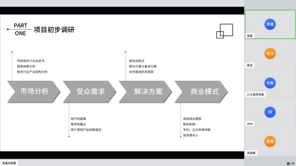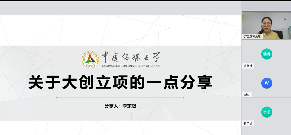 之后,动画与艺术学院18级本科生李鑫同学也从自身经验出发,从项目类别与选题、团队组建两方面阐述如何立项,并借助自身实例向同学们展示了项目管理的要点,强调受众分析与其痛点。除此之外,他还补充说明了结项的相关事宜。
