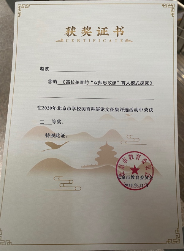 (通讯员 孙靖)为深入贯彻落实习近平总书记关于学校美育的重要思想论述,深化北京市学校美育工作及改革实践,提高北京市学校美育科研水平,北京市教委于2020年11月面向全市各大中小学教师及教育科研院(所)、教育行政部门教育工作者开展了学校美育科研论文征集评选活动。日前,评选结果揭晓,我校马克思主义学院思想政治教育教研部主任赵波副教授喜获二等奖。