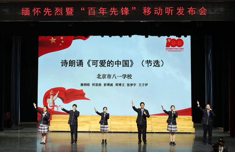 (摄影 王雷亭 申皓文 常能嘉)为庆祝党的百年华诞,丰富党史学习教育的形式载体,更好地教育引导全国大中小学组织开展缅怀先烈活动,4月2日,由中宣部《党建》杂志社和中国传媒大学主办,北京市八一学校、北京市八一学校附属玉泉中学承办,中央党史和文献研究院第七研究部协办的缅怀先烈暨“百年先锋”移动听发布会在北京市八一学校隆重举行。