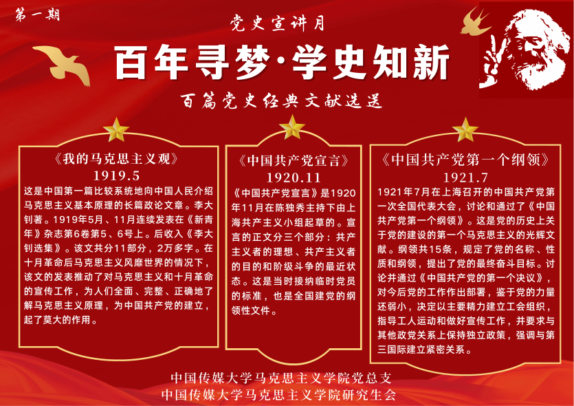 党史宣讲月活动中,马克思主义学院党总支将指导学院研究生会,精心准备百篇党史经典文献选送、主题讲座、爱国主义教育基地参观等系列活动。其中,百篇党史经典文献主要记录党的重要决议和历史性转折,将以海报形式呈现,每日线上推送三至四篇。学院师生将在党史宣讲月以及学校“读百年党史 守传媒初心”春季读书周期间,通过集中学习教育和个人阅读学习,共同见证中国共产党百年苦难辉煌的印迹,感悟革命先辈的精神意志,汲取共产党人的智慧结晶,将党史学习融入马克思主义理论研究,不断攀登学术高峰、产出优秀成果。
