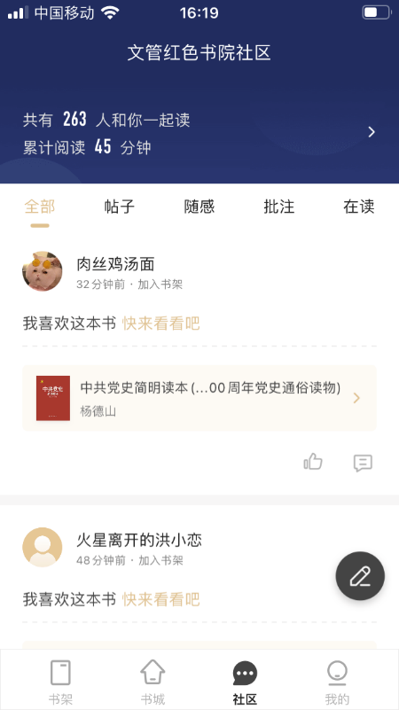 (通讯员 张越 李悠扬)4月29日,中国传媒大学文化产业管理学院党总支联合掌阅精选合作打造的党史学习数字图书馆——“文管红色书院”正式上线运行。数字图书馆“文管红色书院”是为了贯彻落实党中央、教育部、北京市及学校党委关于加强党史学习教育有关精神要求并配合学校“春季读书周”活动而精心规划打造的数字化移动阅读平台。