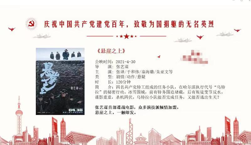 (通讯员 邱瑾锦 摄影 张荣慧)为庆祝中国共产党百年华诞,带领师生回顾党的百年奋斗征程,引导师生继承和发扬党的光荣传统和优良作风,经济与管理学院深入推进党史学习教育,在春季读书周期间,于5月7日举办了“重温红色记忆·弘扬民族精神”主题观影活动,组织部分师生在广告博物馆集体观看《悬崖之上》影片。