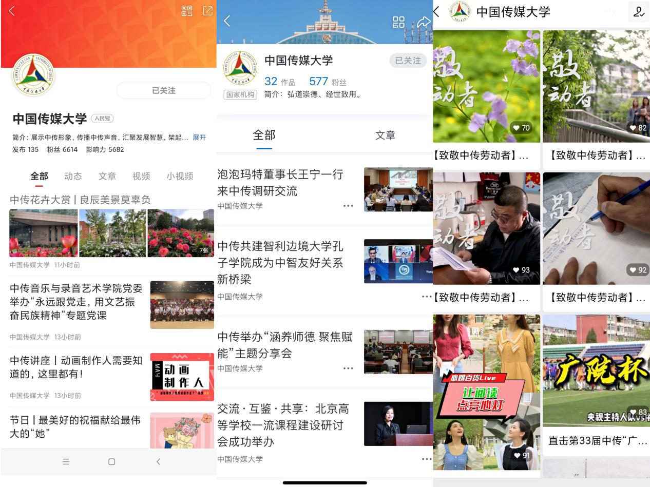 中国传媒大学视频号发挥短视频传播优势,创新宣传报道形式和内容,充分利用微信平台流量,打造“短视频+校园”新品牌,展现学校发展成绩、师生良好风貌和多彩的校园文化活动。中国传媒大学人民号与新华号的开通,将在新闻宣传和舆论引导上发挥聚合优势,打造兼具主流价值和创新活力的优质内容,实现与主流媒体信息共享、同步跟进,扩大传播覆盖面和效果。