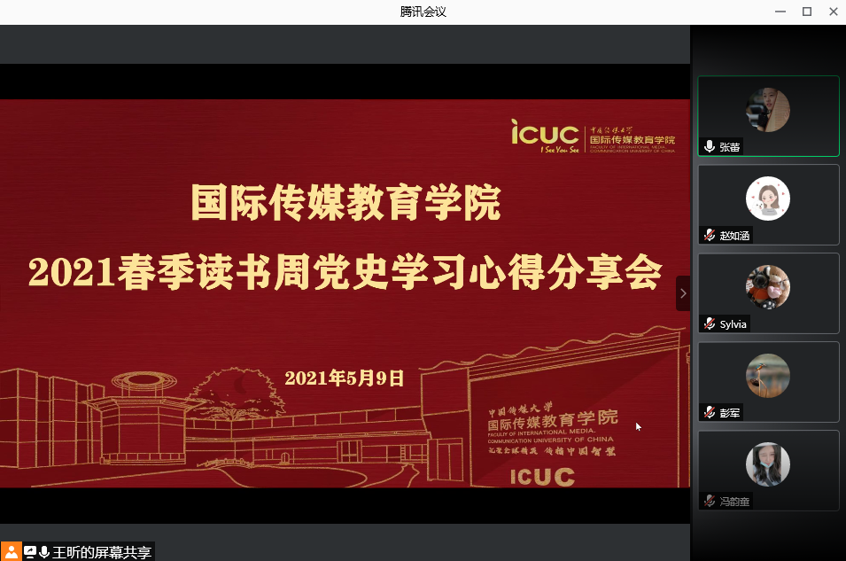 (通讯员 王昕 摄影 周杨)5月9日,国际传媒教育学院举行春季读书周党史学习教育心得线上分享会。学院院长、党总支副书记金雪涛等领导班子成员以及学院全体教职工参加本次活动。