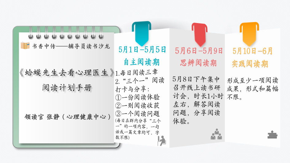 在张静老师的带领下,读书周期间老师们围绕《蛤蟆先生去看心理医生》进行了精读,成立了“读书沙龙”线上活动群,实现阅读“云充电”。《蛤蟆先生去看心理医生》这本书基于沟通分析心理学的理论,讲述了抑郁症患者蛤蟆先生和心理咨询师苍鹭的十次心理咨询,并最终找回快乐和自信的全过程,书中把丰富的心理咨询相关专业知识揉进了妙趣横生的故事里,是一本富有深度的心理疗愈书籍。