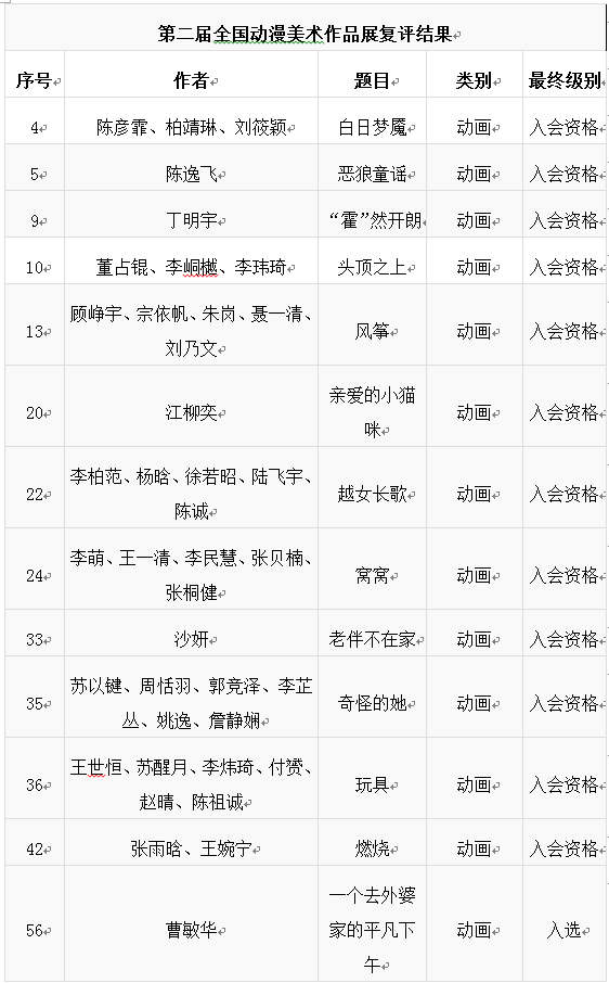 (通讯员 许莹)5月11日,中国美术家协会官网公布第二届全国动漫美术作品展复评结果,我校动画与数字艺术学院师生创作的38部动漫作品通过层层选拔,从初评入围的402部优秀作品中脱颖而出,其中《白日梦魇》等12部作品直接赢取入会资格,《电器人》等26部作品则共同获得复评入选席位。