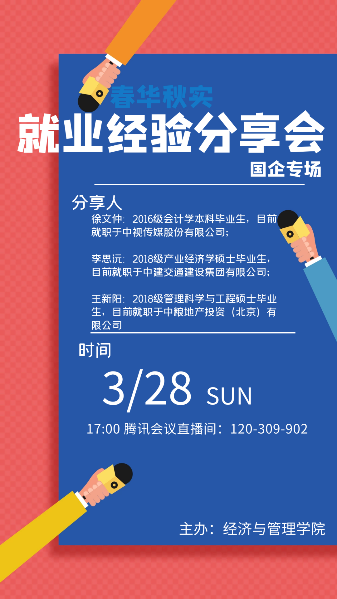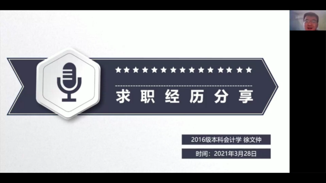 第一场分享会为国企专场,学院三位专业不同的毕业生带来了国企类单位求职就业的经验分享。2016级会计学徐文仲就求职流程、简历内容等方面,分享了自己的经历,并对同学们大学四年的学习规划提出建议,强调成绩对国企类单位求职的重要性。2019级产业经济学硕士李思沅则从求职方向、职业规划与面试准备等方面,分享了经验与建议。2018级管理科学与工程硕士王新阳分享了求职经历、简历内容和笔试面试等方面经验,并介绍了国企单位的工作内容与环境。