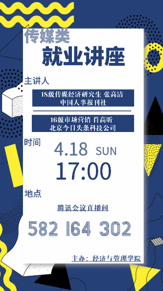 (通讯员 白佳乐)3月18日至5月9日,经济与管理学院面向学院全体学生举办了三次“春华秋实”就业指导讲座求职系列专场,学院就业工作联系人徐驰、就业经验分享人参加系列活动。系列讲座依托线上平台,通过经验分享与互动交流指导在校学生的就业规划、助力学生成长成才。