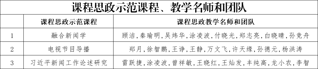 (通讯员 付李琢)日前,教育部公布了首批课程思政示范项目立项结果,我校推荐的两门本科课程《融合新闻学》《电视节目导播》、一门研究生课程《习近平新闻工作论述研究》均获评“课程思政示范课程”,三门课程的任课教师和教学团队获评“课程思政教学名师和团队”。此次课程思政示范项目是首次全国范围内的课程思政项目评选,也是教育部全面推进课程思政高质量建设的有力举措,具有重要的引领价值与示范作用。