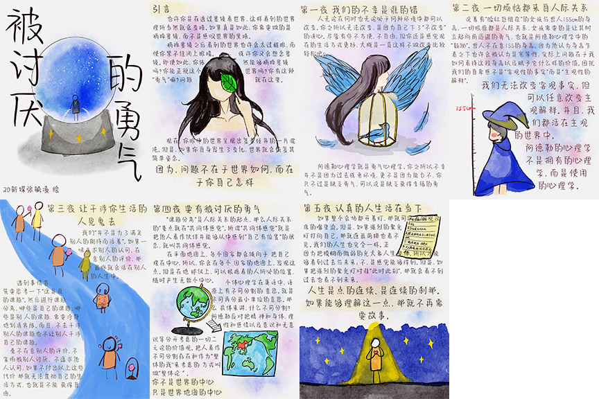 活动上,周曦老师领读了《被讨厌的勇气》,分享了阿德勒的心理学思想,告诉大家要悦纳自己,积极应对人际交往问题;王潇斐同学分享了《设计心理学1——日常的设计》,她将心理学和专业学习相结合,给大家介绍了许多与生活息息相关的优秀设计;王功利同学最后分享了《蛤蟆先生去看心理医生》,运用童话一样轻松舒缓的方式,让大家跟随书中的蛤蟆先生进行了心理咨询方面知识的学习,完成了一次心灵理疗。